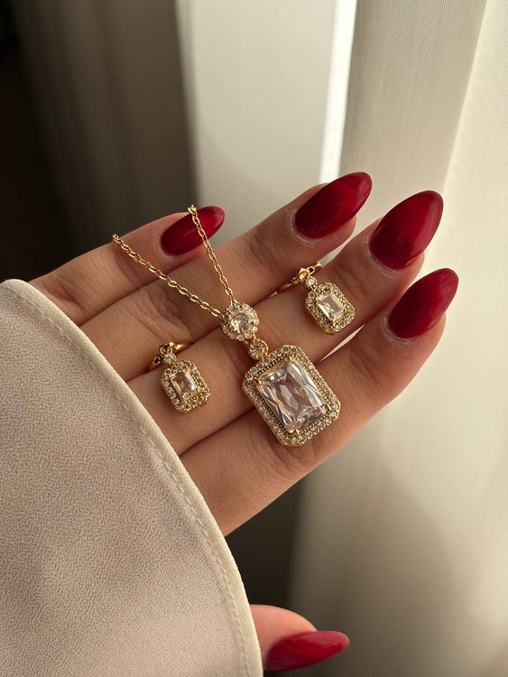 نیمست سولیترطلایی-طول زنجیر ۴۷ سانت-نگینها مخراج کاری شده-نگینها بی رنگ و فریم طلایی میباشد🌱انگشتر جداگانه در دسته بندی انگشترها میباشد🌺