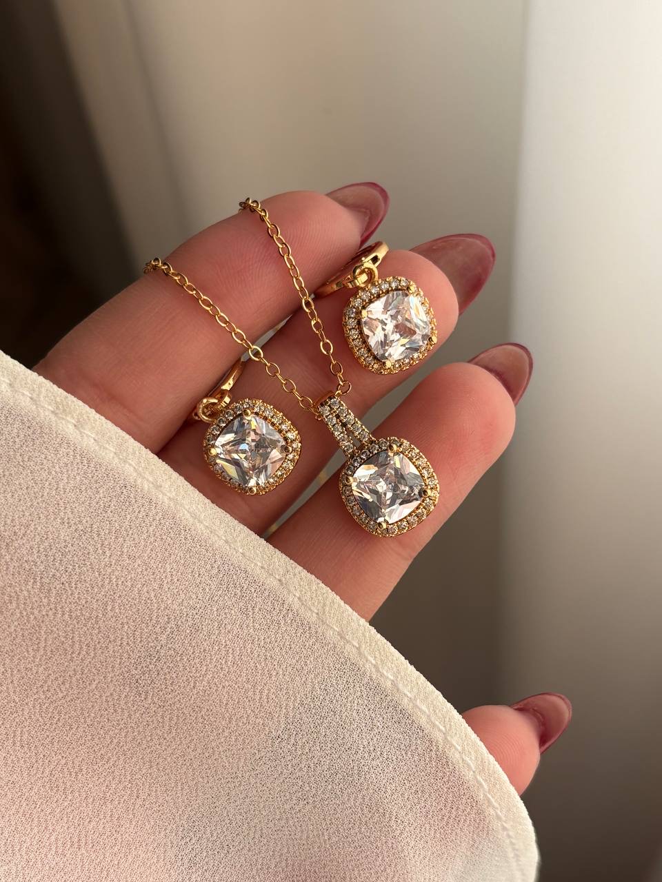 نیمست سولیترطلایی-طول زنجیر ۴۷ سانت-نگینها مخراج کاری شده-نگینها بی رنگ و فریم طلایی میباشد🌱