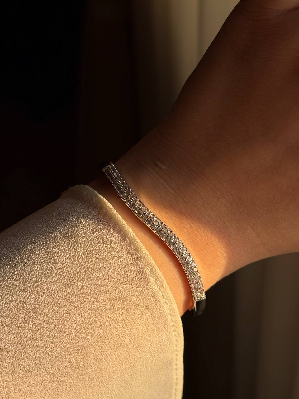 دستبند بنگل با کیفیت نقره ای-دارای قفل کنار دستبند-قطر دستبند ۶ سانت- مناسب دستهای متوسط-نگینها مخراج کاری شده و چسبی نیستند❇️
