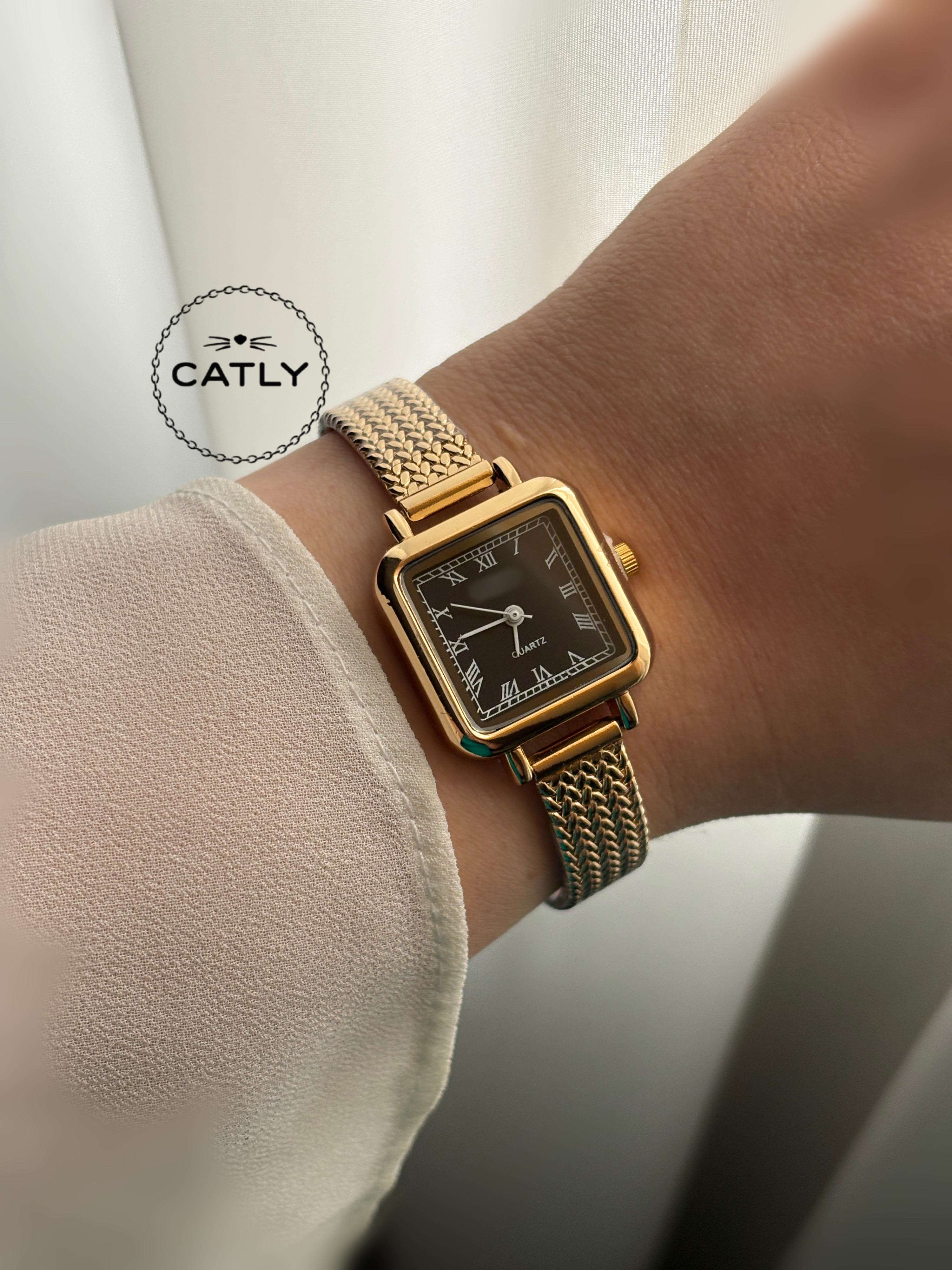 ساعت بند حصیری مربعی طلایی مشکی